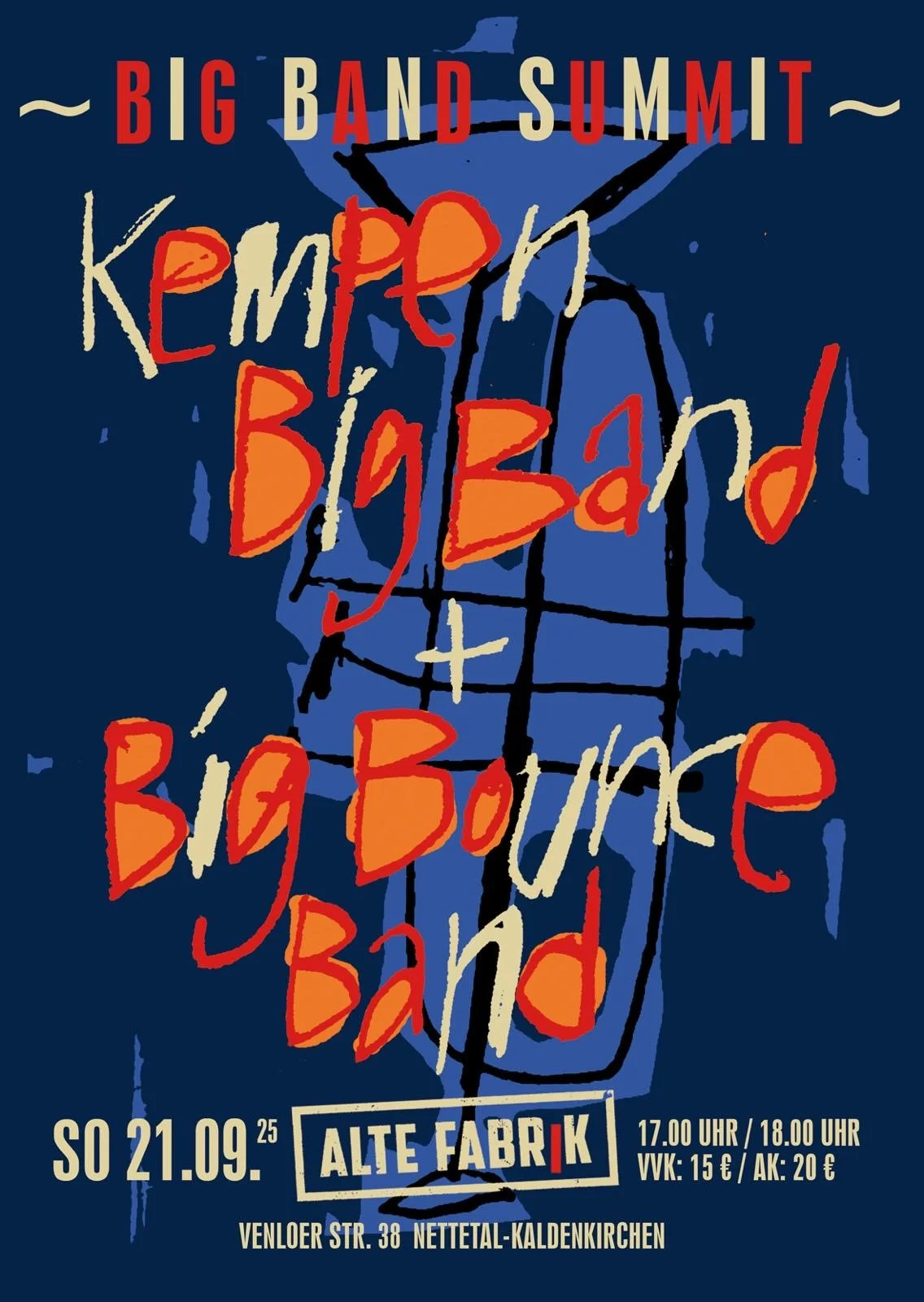 Die KEMPEN BIG BAND (Kempen | D) spielt seit 1981 zusammen; seit 1991 leitet der international bekannte Trompeter Markus Türk die 24 Musiker der klassisch besetzten Band. Sie sind nicht nur am Niederrhein geschätzt bei Liebhabern des satten Big-Band-Sounds. Die Band spielt anspruchsvolle, traditionelle Jazz-Standards. Kompositionen und Arrangements von Joe Zawinul, Dizzy Gillespie, Sammy Nestico, Jerome Kern, Miles Davis, Bob Mintzer, Thad Jones, Herbie Hancock u. v. mehr gehören genauso zum Repertoire wie Aktuelles von Michael Bublé oder Paul Anka. Alle Gesangsstücke interpretiert unser junger Sänger Ilyas Adjana stilgerecht und jazzig.